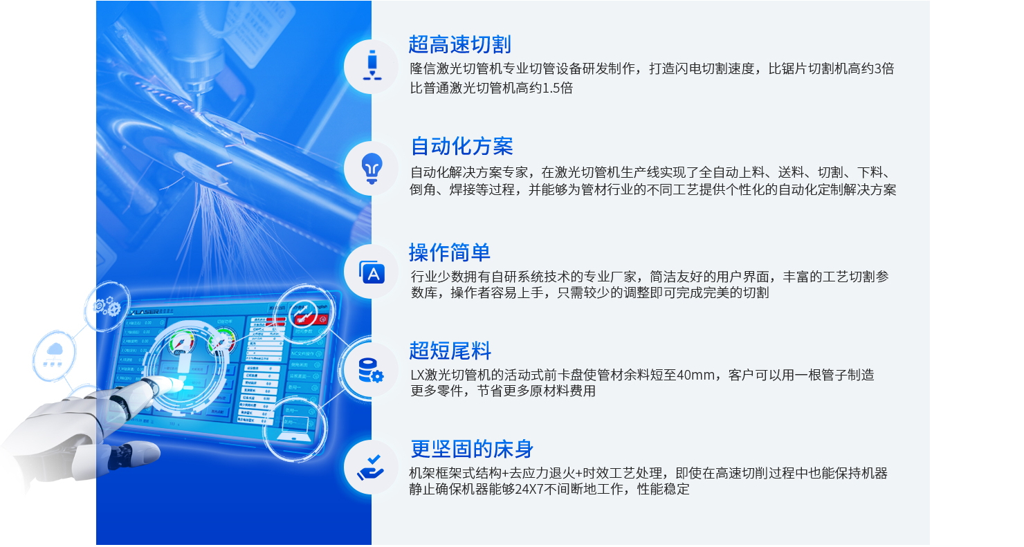 管材加工智能生產(chǎn)線,高度靈活的模塊化設(shè)計,多環(huán)節(jié)集成一體,實現(xiàn)自動化生產(chǎn),減少人力成本,提高效率??筛鶕?jù)行業(yè)需求定制,多種智能加工模式助力企業(yè)快速投產(chǎn)。
